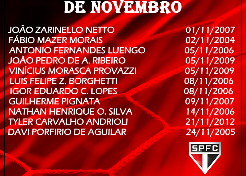 01 Nov Aniversariantes do Mês de Novembro Autor: Escola Oficial SPFC - Sertãozinho A Escola Oficial São Paulo parabeniza todos alunos aniversariantes do mês de Novembro