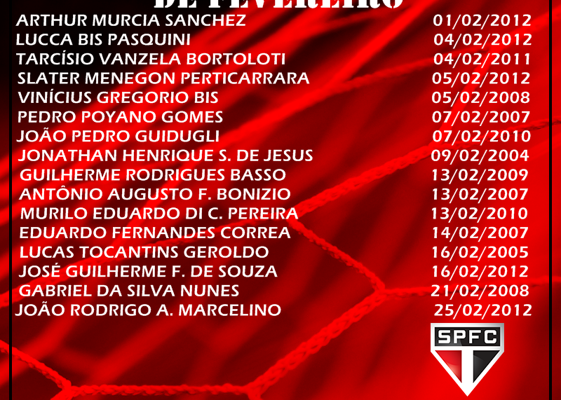 01 Fev Aniversariantes do mês de Fevereiro Autor: Escola Oficial SPFC - Sertãozinho A Escola Oficial São Paulo parabeniza todos alunos aniversariantes do mês de Fevereiro