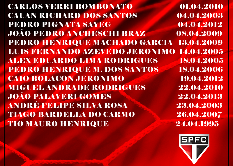 02 Abr Aniversariantes do mês de Abril Autor: Escola Oficial SPFC - Sertãozinho A Escola Oficial do São Paulo parabeniza todos os alunos aniversariantes do mês de Abril!
